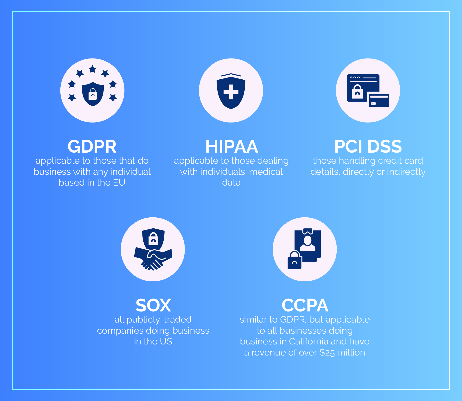 - CCPA (California Consumer Privacy Act) - is a law that came into effect in January 2020, and is one of the toughest consumer protections that many US-based businesses face. It has been described as California's equivalent of GDPR, and it takes a broader view of what is defined as private data, including any information from which inferences can be drawn to create a customer profile. CCPA compliance applies to companies that have gross annual revenues above $25 million, those that buy, receive, or sell the personal information of 50,000 or more consumers, households, or devices, or businesses that derive 50% or more of their annual revenue from selling consumers' personal information.