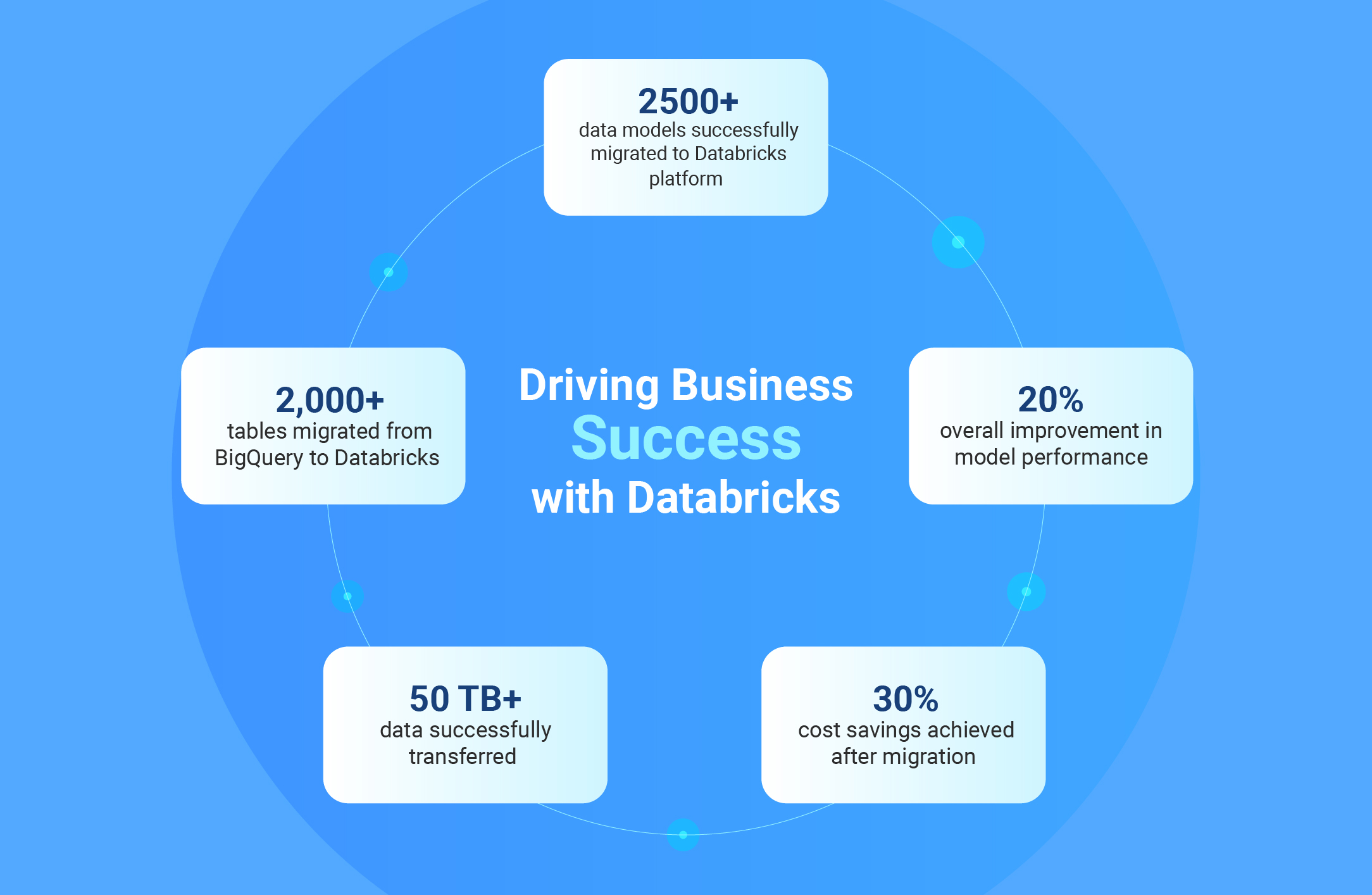 With approximately 2500 data models performing different sets of data analysis activities, the client was facing mounting costs and performance issues. To address this, the team undertook a migration process, transferring over 2,000 tables from BigQuery to Databricks. In total, 50 TB+ of data was successfully migrated, resulting in improved cost efficiency and overall performance.